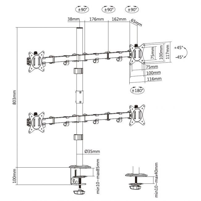 Ideal para multitarea, juegos o trabajo profesional, este soporte maximiza el espacio del escritorio al tiempo que garantiza la estabilidad gracias a su robusto diseño. La gestión de cables integrada mantiene los cables ordenados y reduce el desorden. Ya sea en una oficina, en un puesto de trabajo doméstico o en una instalación de ocio, el soporte de sobremesa para cuatro monitores mejora la inmersión visual y la eficacia multitarea. Es un accesorio valioso para quienes buscan una disposición de monitores racionalizada y flexible para satisfacer sus diversas necesidades informáticas."