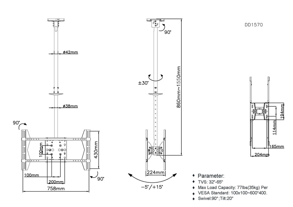 El soporte de techo doble para TV de calidad industrial de equip es la elección perfecta para aplicaciones de señalización. El dispositivo de inclinación ajustable permite la instalación con una inclinación precisa y uniforme de las pantallas montadas para una visibilidad óptima de la pantalla. La elección ideal para anunciarse al público