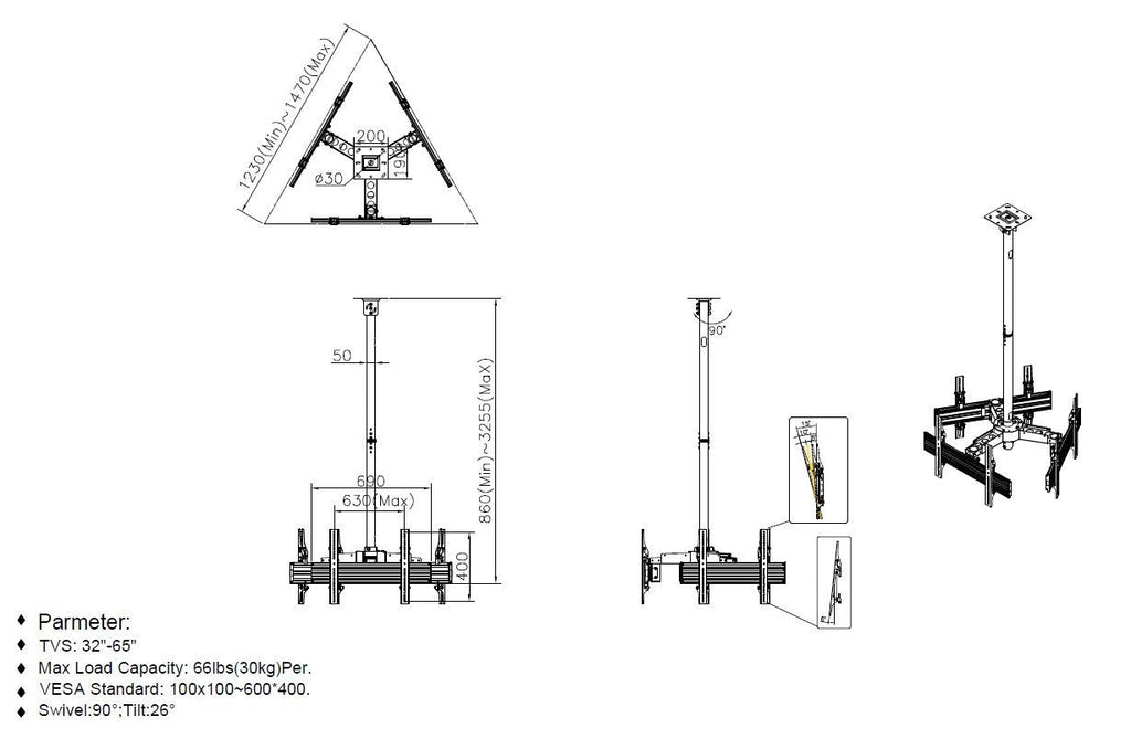 El soporte de techo para tres televisores de calidad industrial de equip es perfecto para aplicaciones de señalización. El ajuste de inclinación permite la instalación con una inclinación de pantalla precisa y uniforme de las tres pantallas para proporcionar unas condiciones de visualización ideales. La elección ideal para publicidad.