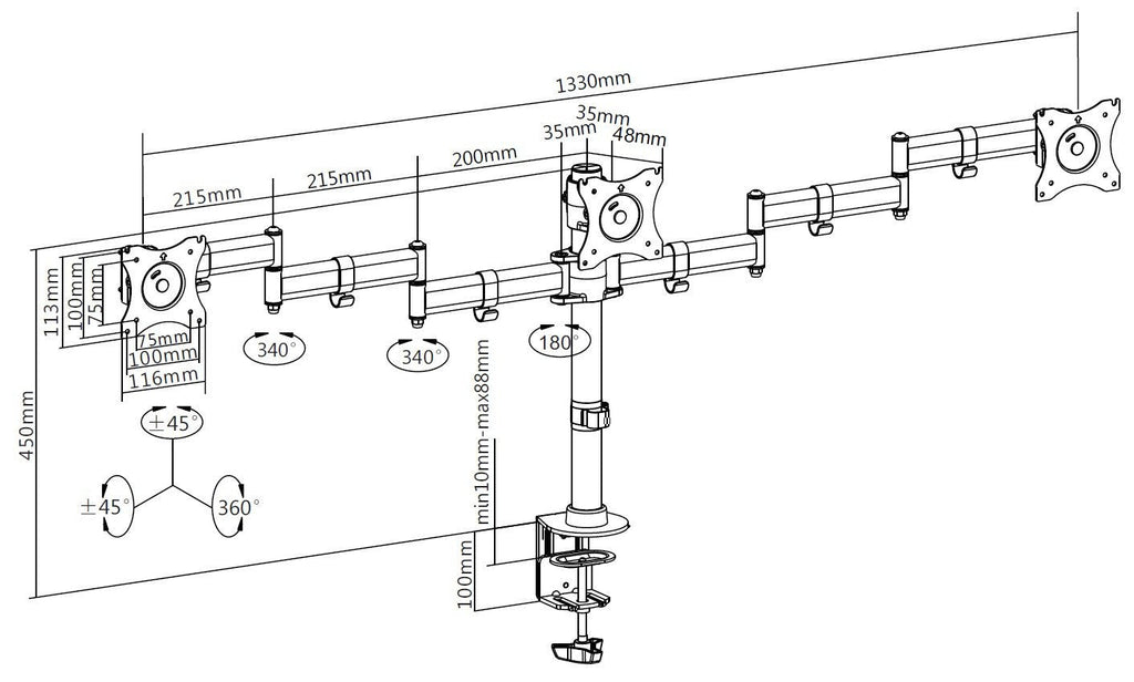 "El soporte de sobremesa articulado para tres monitores equip® de 13 a 27 pulgadas es una solución eficaz para optimizar la multitarea y la organización del espacio de trabajo. Diseñado para alojar tres monitores planos de entre 13 y 27 pulgadas, este soporte ofrece un versátil sistema de brazo articulado que permite realizar ajustes personalizables de inclinación, giro y rotación. Esto permite un posicionamiento ergonómico y ángulos de visión óptimos, mejorando tanto la comodidad como la productividad.