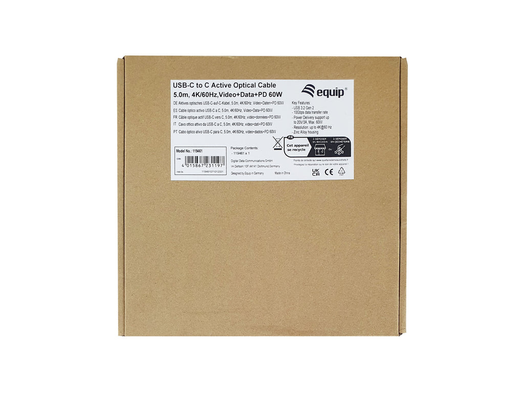 "El equip 119461 Active Optical USB-C to C Video+Data+PD Cable es un permite la salida de vídeo. Utiliza tecnología óptica activa para garantizar que las señales se transmiten con un mínimo de interferencias y pérdidas en distancias más largas que los cables tradicionales. El cable es compatible con dispositivos USB-C como portátiles, tabletas y smartphones, y se puede utilizar para diversos fines mostrando contenido de vídeo en monitores externos.