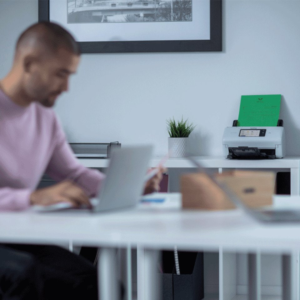 Con sensor incorporado para eliminar atascos de papel, el ADS-4700W tiene una capacidad de alimentación de papel de 80 hojas y escanea rápidamente hasta 80 páginas por minuto (a doble cara). El botón de separación permite elegir entre escanear documentos muy gruesos o finos, tarjetas de plástico y papel arrugado.