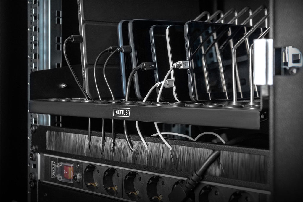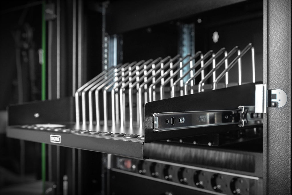 La solución ideal para guardar y cargar sus dispositivos portátiles en un armario de red o de servidores estándar.