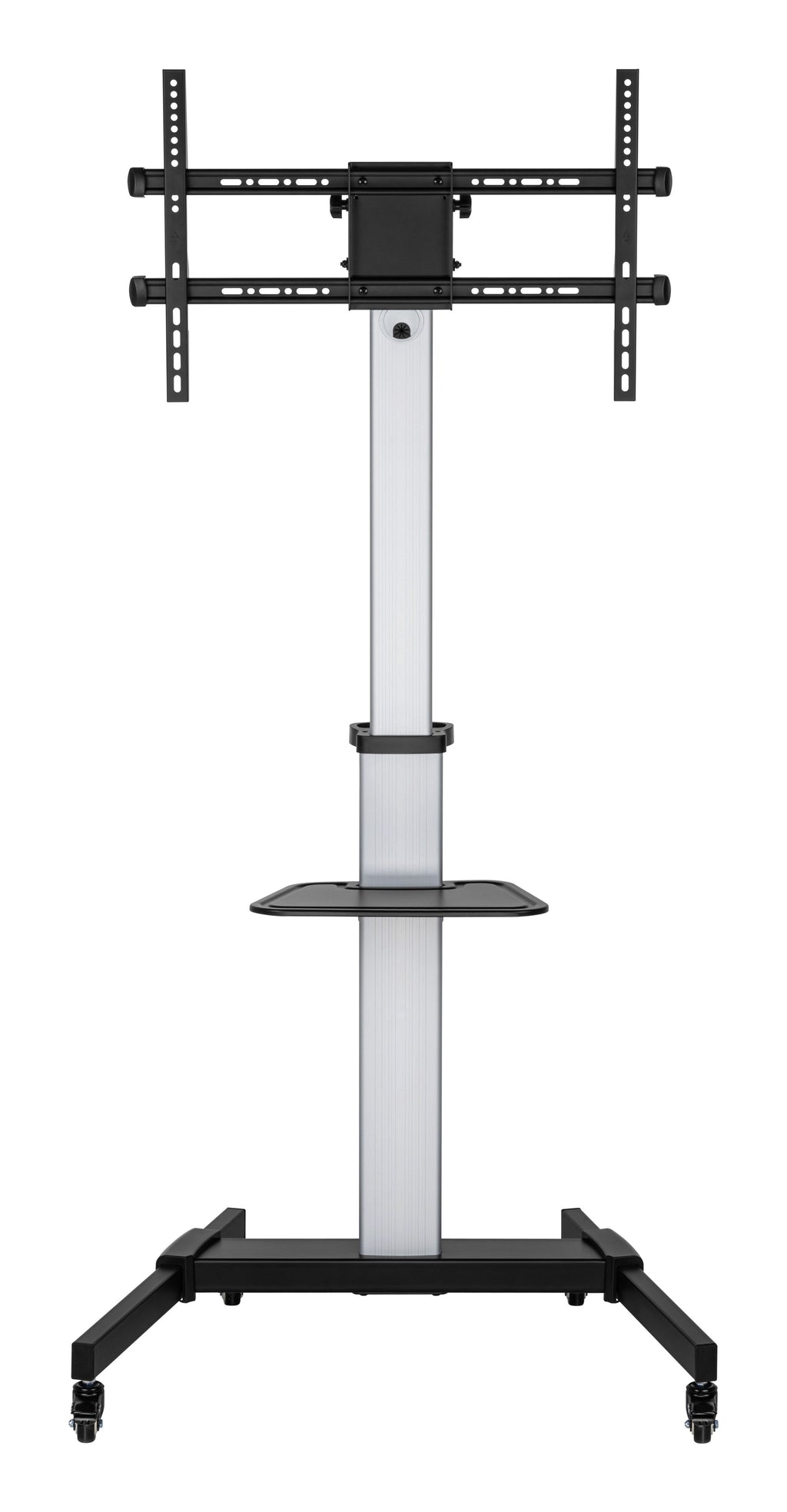 Permite visualizar la pantalla en formato vertical u horizontal gracias a su rotación de hasta 90°, lo que lo hace adaptable a diferentes tipos de presentaciones. El estante ajustable en altura ofrece un espacio útil para almacenar accesorios, y la inclinación sin herramientas (+5°/-10°) permite ajustar fácilmente la posición del televisor.