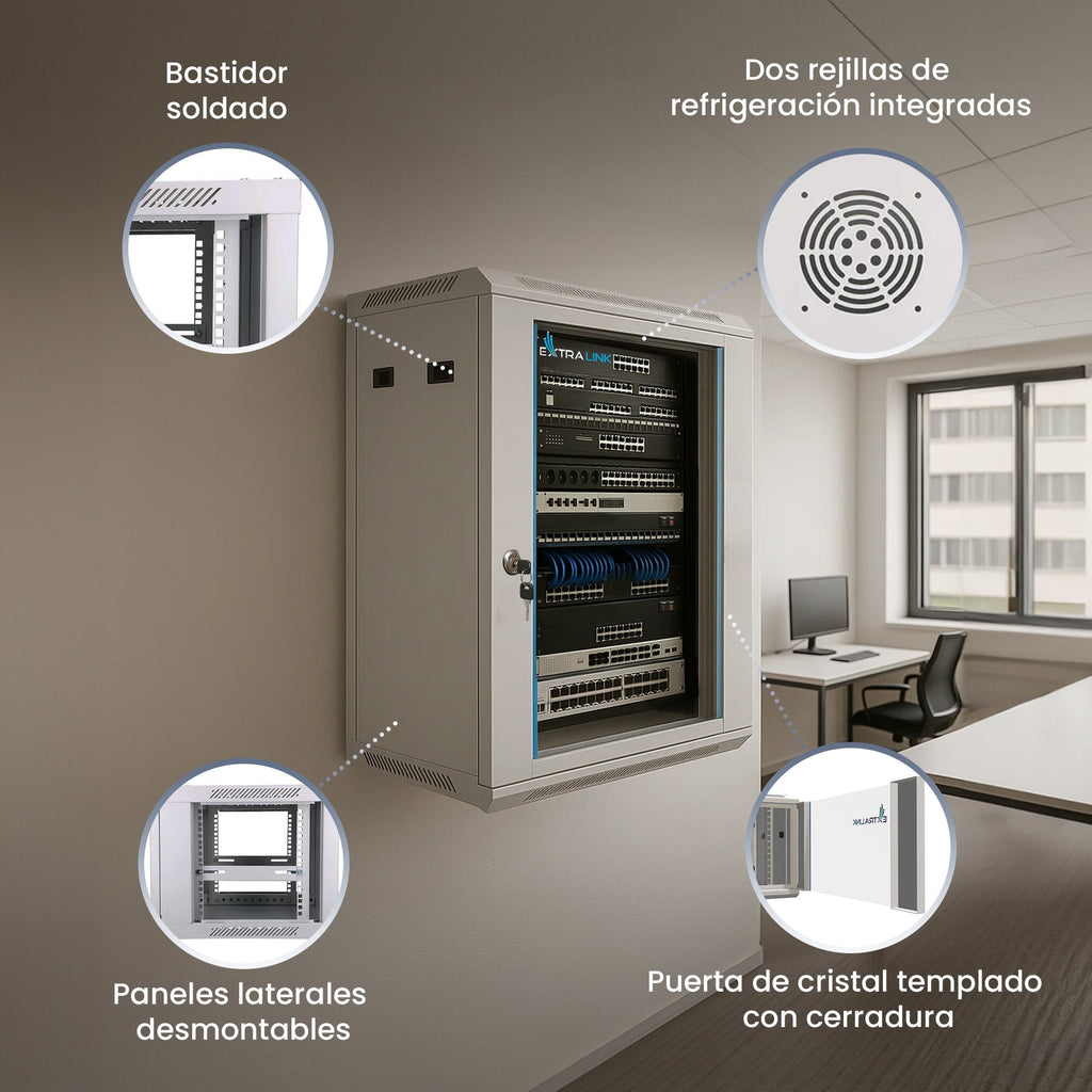- Acceso fácil a cables y equipos gracias a paneles removibles.