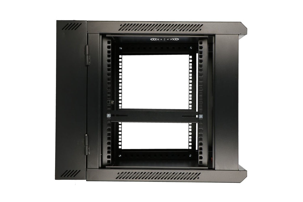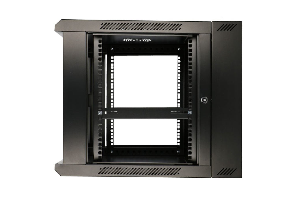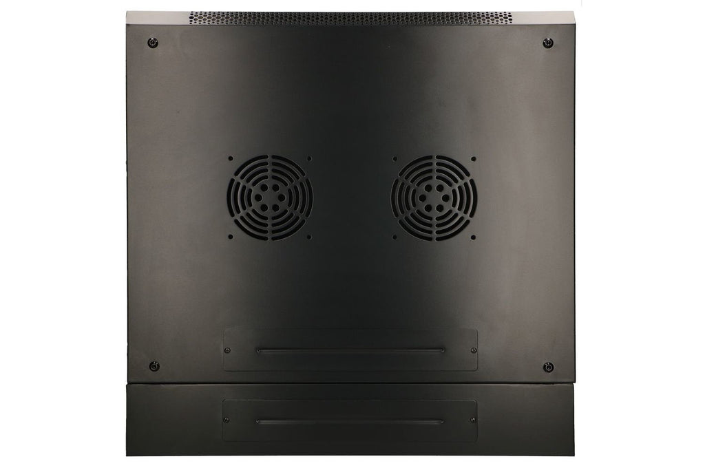 El armario cuenta con rieles verticales claramente marcados que indican una altura de 12U (de la unidad en inglés). La altura total del armario es de 64 cm, lo que lo convierte en una solución compacta para diversas aplicaciones.