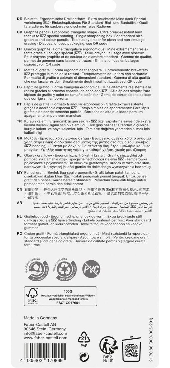 Faber-Castell 217086, B, Negro, Triangular, Arte, Dibujo gráfico, Tiempo de ocio, Oficina, Escuela, Technical drawing, Blister, 5 pieza(s)