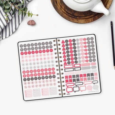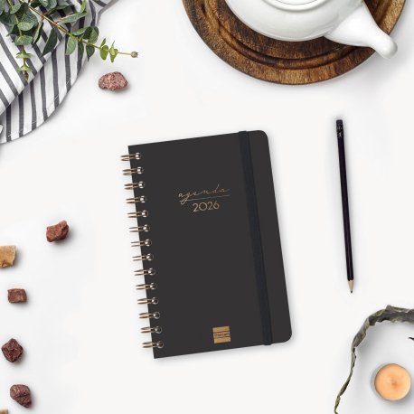 Agenda de espiral de tapa dura de cartón forrado con peliculado mate antirrayaduras. Diseño elegante y sofisticado con detalles estampados metalizados. Ideal para uso personal y/o profesional. Con goma elástica y esquinas microperforadas para localizar rápidamente el día/semana en curso. Incorpora un set de adhesivos temáticos. El diseño interior es limpio y fácil, con espacio suficiente para organizar tus proyectos, tareas y compromisos. Contiene información de interés en la anualidad y otros contenidos extra orientados a la organización personal.