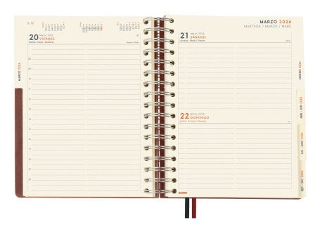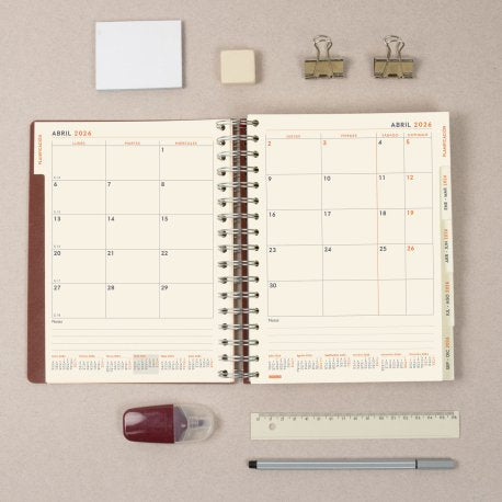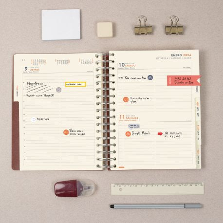 Agenda de tapa extradura de polipropileno, con espiral doble y goma elástica. Con dos cintas punto para poder acceder rápidamente a las secciones que desees. La agenda anual Tempus te ayudará a planificar tus metas, objetivos y compromisos, ya que está diseñada para facilitar la organización diaria del tiempo personal y de trabajo para adaptarse completamente a ti. Al inicio dispondrás de un apartado introductorio donde se detalla cómo usarla para sacarle el máximo partido; un tutorial con recomendaciones útiles de organización personal. Cuenta con información de interés en la anualidad, muchos contenidos orientados a la planificación del tiempo y muchas hojas libres para que asignes los temas de tu interés. En el apartado de Descargas de la web Finocam podrás personalizarte tu agenda con contenidos especiales. Además, viene con listas microperforadas para arrancar, adhesivos temáticos, una funda y un set de notas engomadas. Da la bienvenida a tu nueva vida, mucho más tranquila, organizada y feliz, porque a pesar de vivir en la multitarea es importante priorizar las cosas y llegar a todo sin estrés. ¡Tu futuro depende de lo que hagas hoy!