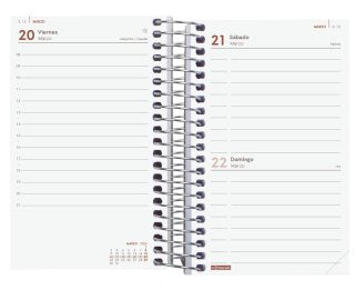 Agenda de espiral de estilo moderno. Con tapas ligeras de polipropileno y goma elástica. Ideal para uso personal y/o profesional. Esquinas microperforadas para localizar rápidamente el día/semana en curso. Agenda con información de interés en la anualidad y otros contenidos extra.