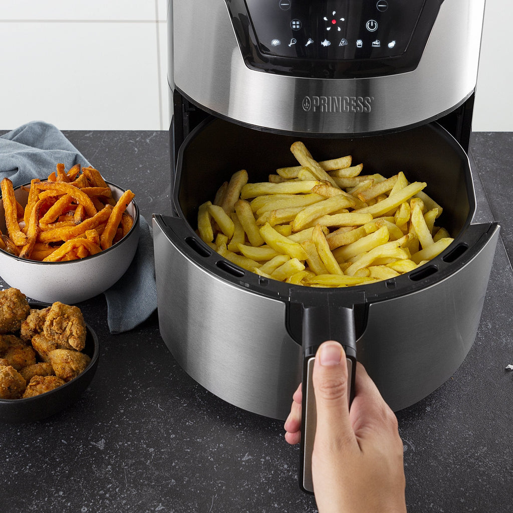 Servir la comida es fácil y seguro con la cesta extraíble con asa fría al tacto. La cesta extraíble y el cajón con revestimiento antiadherente de la freidora Princess Digital Aerofryer son aptos para el lavavajillas para una fácil limpieza. Con su base antideslizante, la freidora Aerofryer se mantiene firme sobre cualquier superficie y no se cae ni se desliza fácilmente. Otra medida de seguridad es la protección contra sobrecalentamiento que evita que se caliente la freidora Aerofryer. La freidora de aire Princess será su electrodoméstico favorito para preparar comida saludable y deliciosa.
