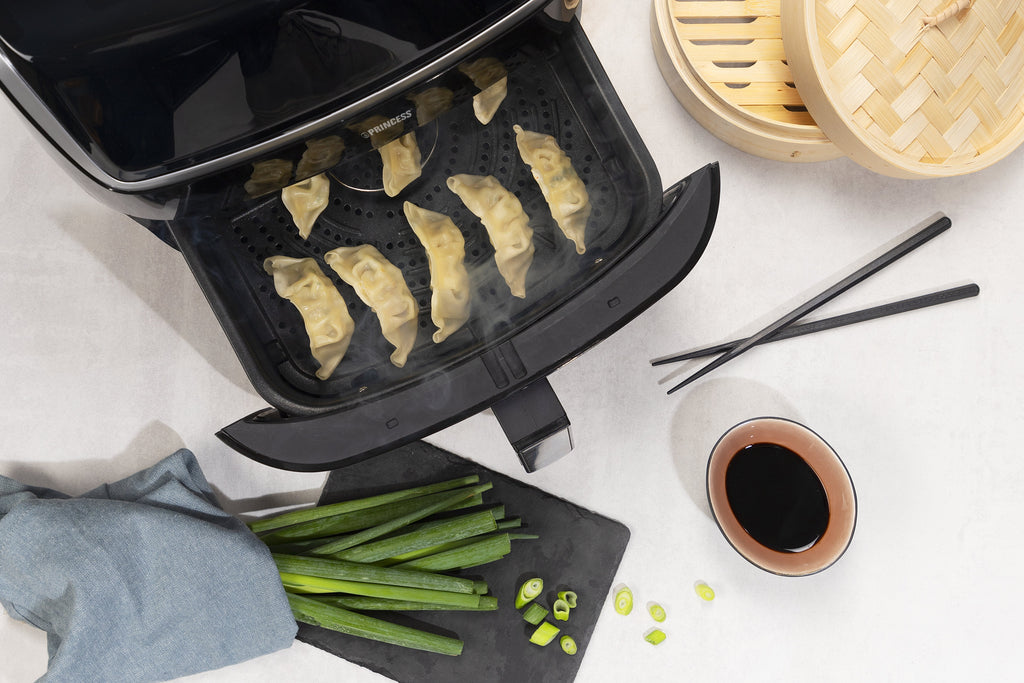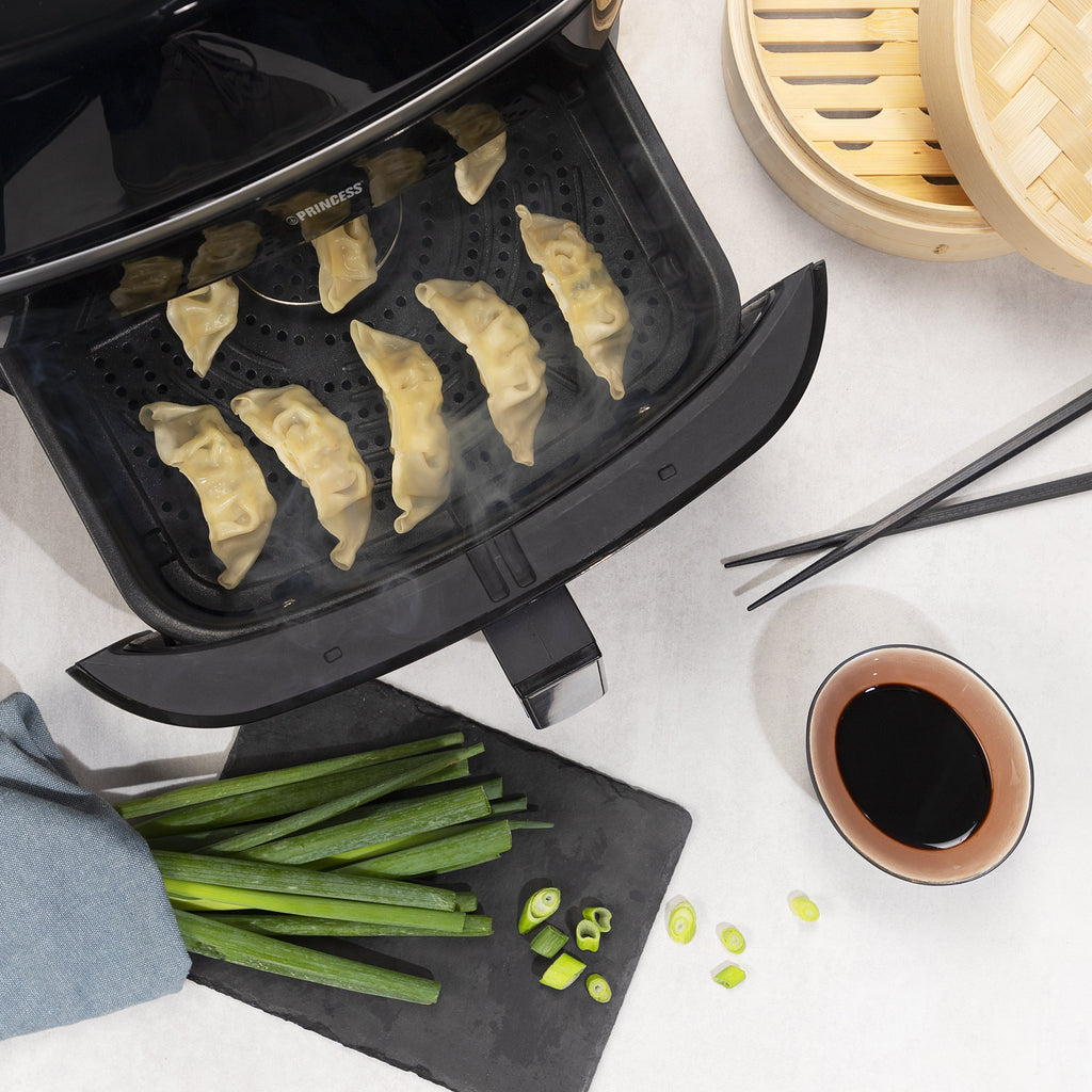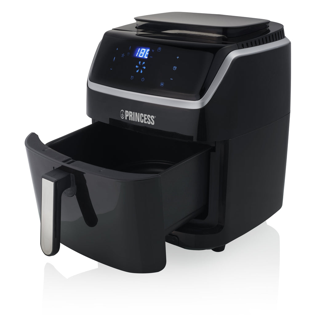 Freidora sin aceite + vaporera de Princess, rejilla de vapor, cesta para la freidora, recetario, manual