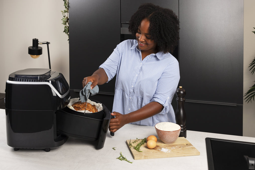 La freidora sin aceite + vaporera de Princess incluye un panel de control digital táctil, práctico e intuitivo con el que podrá definir fácilmente el tiempo y la temperatura de cocción. También incluye 8 programas predefinidos para preparar verduras al vapor, pollo, pescado, carnes rojas, pan, patatas fritas, pasta y arroz. ¿Le gusta desayunar pan recién hecho? Con la freidora sin aceite + vaporera, no necesitará una panificadora. ¡Ambas funciones se encargan de todo!