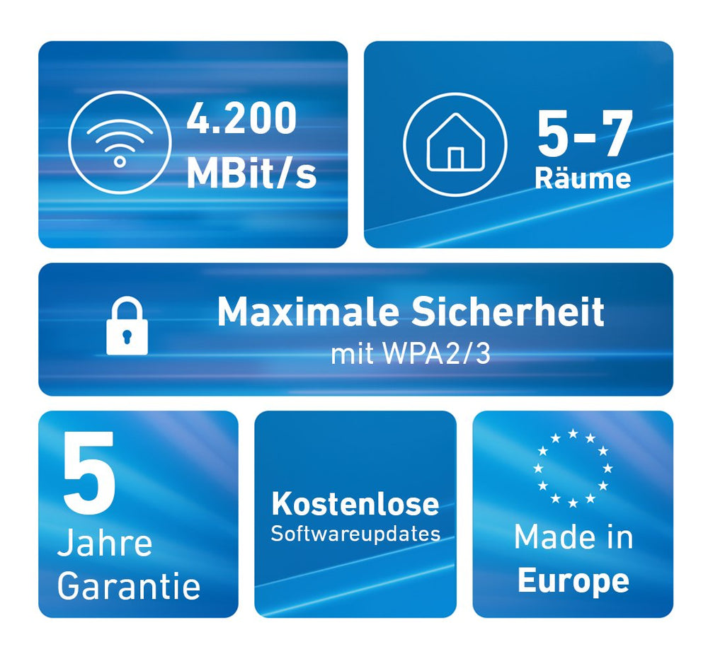 - Wi-Fi Mesh: todos los puntos de acceso Wi-Fi del pack se combinan en una única red Wi-Fi inteligente con un rendimiento óptimo. Instalación sencilla y segura con sólo pulsar un botón (WPS). LEDs para determinar la posición óptima del FRITZ!Repeater, señalando la intensidad de la señal Wi-Fi ó o con la ayuda de la FRITZ!App WLAN