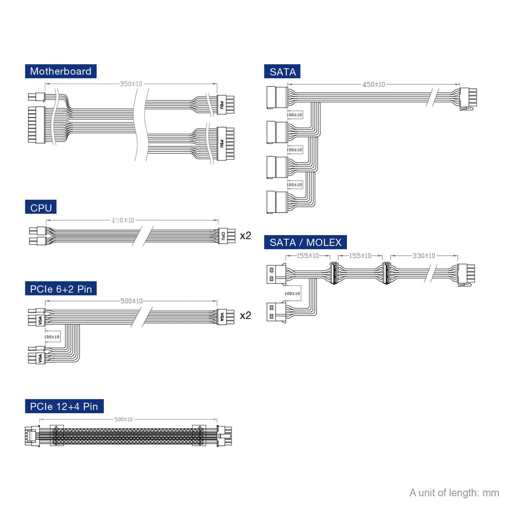 - Longitud del cable de conectores de alimentación PCI Express (12+4 pines): 500 mm