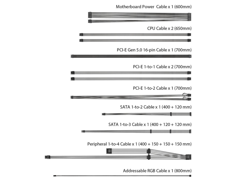 - Cables incluidos: Corriente alterna, CPU, PCIe, Peripheral (Molex), SATA