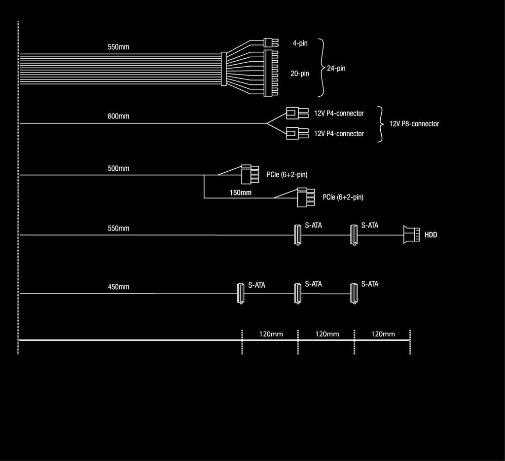 - Longitud del cable de alimentación SATA: 450,550,570,670,690,790 mm