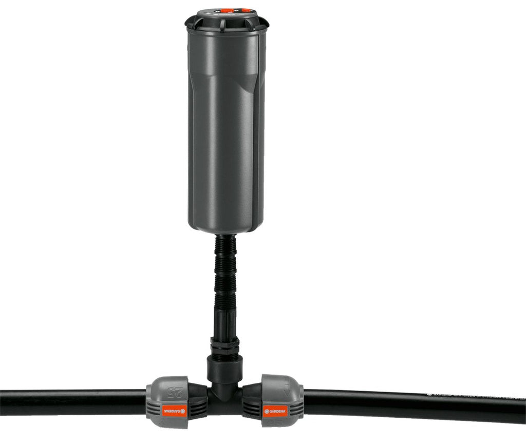 Como parte del sistema de riego enterrado GARDENA, la pieza en T de 25 mm y la rosca hembra de 3/4" GARDENA permiten instalar la válvula de drenaje (nº art. 2760-20) dentro de la trayectoria del tubo. A través de la tecnología de conexión sencilla "Quick & Easy", el montaje o desmontaje del tubo se realiza sin necesidad de herramientas simplemente girando el tornillo 140 º. La conexión roscada de la pieza en T es autosellante para proporcionar un funcionamiento seguro y estanco al agua.