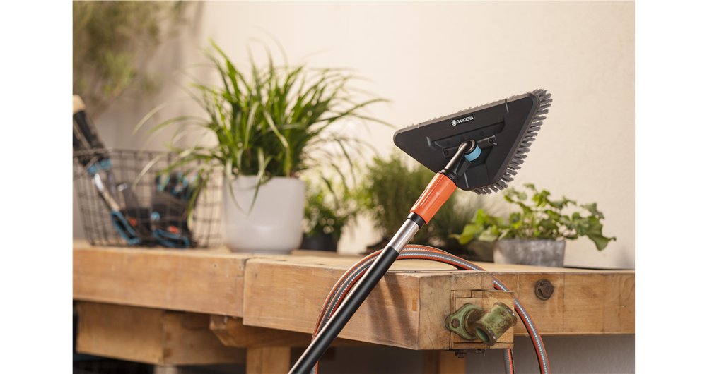 Conductor de agua: al conectar un mango a la manguera, el cepillo suave limpia grandes superficies delicadas de exterior Delicado: con cerdas suaves, el cepillo acoplable es perfecto para limpiar con delicadeza superficies sensibles Práctico: el cabezal de cepillo triangular se puede girar y orientar en todas direcciones para llegar a las esquinas GARDENA extiende una garantía de 5 años al registrar este artículo. Más información en la descripción del producto Contenido del producto: 1 Cepillo GARDENA Cleansystem suave flex El cepillo acoplable GARDENA Cleansystem suave flex convence por el lavado delicado de superficies exteriores grandes, de difícil acceso, como pérgolas. Una limpieza con agua exhaustiva y delicada de superficies exteriores grandes y sensibles Para limpiar a fondo las superficies en un instante, basta con conectar el cepillo acoplable suave flex Cleansystem con un mango Cleansystem y fijarlo a la manguera de jardín. Es muy fácil de usar para realizar todo tipo de tareas de limpieza en grandes superficies de la casa y los resultados hablan por sí mismos. Cerdas suaves para una limpieza suave y delicada sin causar daños Las cerdas suaves del cepillo se han desarrollado especialmente para todas las zonas exteriores delicadas. Así, se pueden limpiar las superficies de cristal o plástico, como las pérgolas, de forma delicada, cuidadosa y sin dejar arañazos. El cepillo suave conductor de agua permite retirar el polvo, la suciedad y los depósitos de las superficies sensibles de forma sencilla y sin esfuerzo. Cabezal de cepillo con rotación de 360° para una limpieza eficaz en todas las direcciones El cabezal de cepillo totalmente orientable permite trabajar de forma flexible con el cepillo de limpieza. Así, se adapta perfectamente a la superficie de limpieza. El cepillo triangular está equipado con una articulación flexible que permite llegar a esquinas y rincones de difícil acceso. La perfecta interacción con los mangos y barritas de limpieza GARDENA Cleansystem En combinación con los mangos conductores de agua (art. 18800, 18802, 18804), es especialmente eficaz en superficies delicadas. Con el uso del champú GARDENA (art. 18818), la eficacia del cepillo es aún mejor. Se insertan fácilmente en el dispensador del mango y pueden dosificarse según sea necesario, lo que permite una limpieza en profundidad de la superficie. Calidad GARDENA para un resultado de limpieza impecable y de confianza El cepillo de cerdas suaves se fabrica en Alemania y convence por la gran calidad y durabilidad. Para que el cepillo de superficies siga prestando una limpieza perfecta durante años, tiene que almacenarse con las cerdas hacia arriba. GARDENA le concede una garantía de 5 años para el producto tras registrarse en: gardena.com/registration en un plazo de 3 meses desde la compra. Condiciones de garantía en gardena.com/es/c/asistencia/registro-garantia.