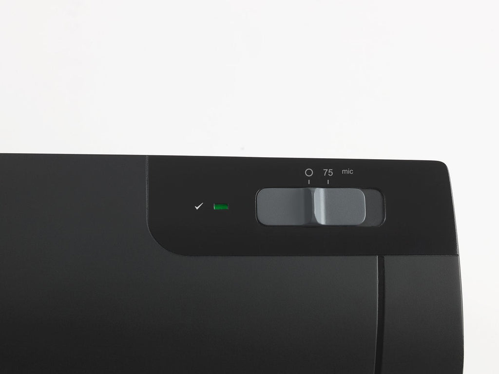Ideal para el hogar o para la pequeña oficina, la plastificadora Fusion 1000L en formato A4 garantiza resultados perfectos con el simple encendido del un interruptor, con una práctica luz verde indicadora como aviso de que ya se ha calentado y está lista para su uso. Elegante y ultracompacta para su almacenamiento, la Fusion 1000L plastifica desde documentos de identidad hasta tamaño A4, en menos de un minuto empleando carteras estándar de 2 x 75/80 micras.
