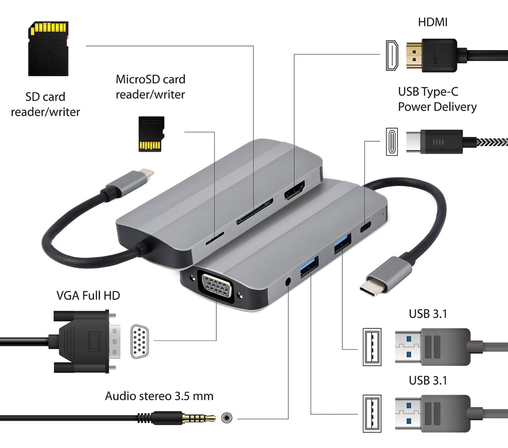 - 8 en 1: concentrador USB de 2 puertos, HDMI 4K, puerto LAN Gigabit, lector de tarjetas y soporte de carga PD USB tipo C