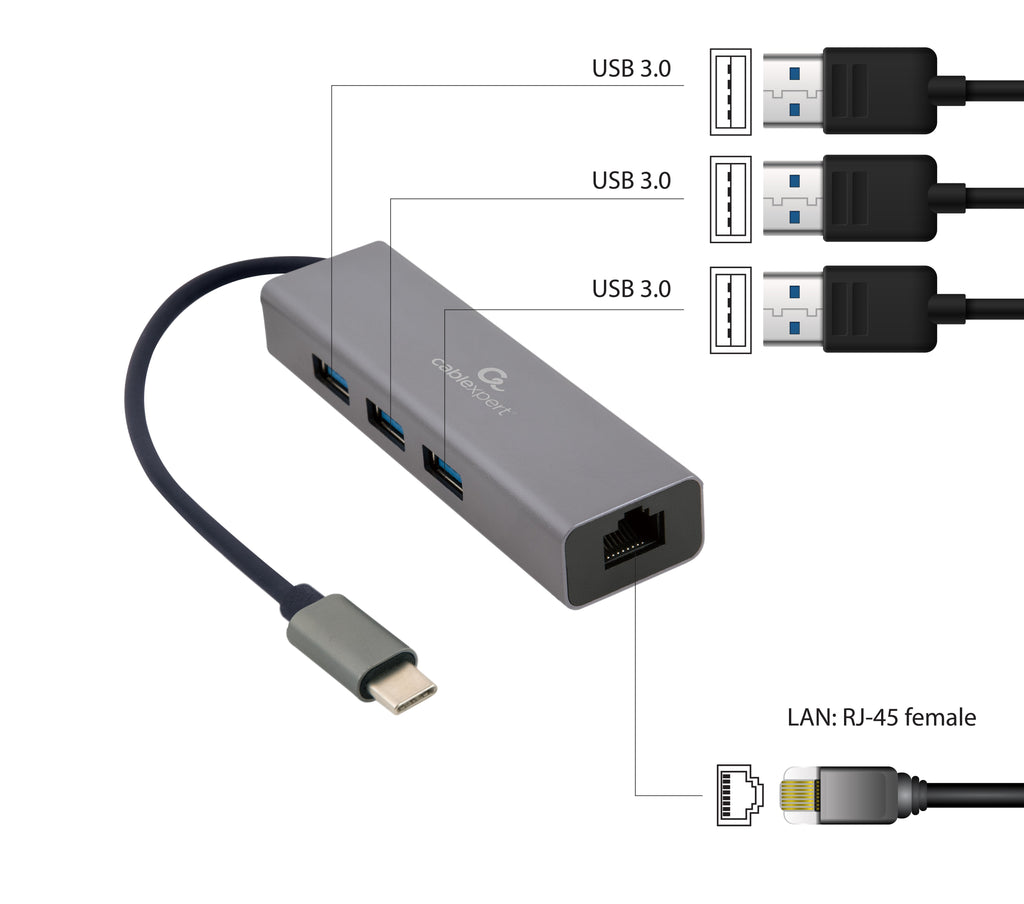 Gembird A-CMU3-LAN-01 base para portátil y replicador de puertos USB 3.2 Gen 1 (3.1 Gen 1) Type-C Gris