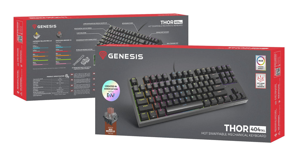 Una nueva encarnación de una leyenda. Bienvenido Genesis Thor 404 TKL – el sucesor del aclamado y galardonado modelo Genesis Thor 303 TKL. Un diseño completamente nuevo (tecla no flotante), interruptores Kailh Box Brown V2 que proporcionan una respuesta rapidísima y tecnología Hot-Swap que permite sustituir el mecanismo sin herramientas no son sus únicas ventajas. Nuevo, mejor, más avanzado. Aquí está Genesis Thor 404 TKL