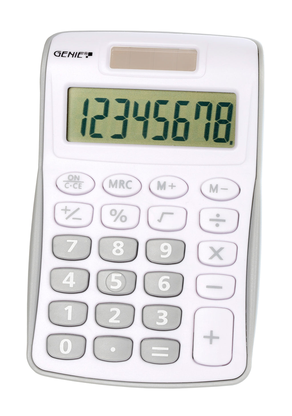 Genie 120 S, Bolsillo, Pantalla de calculadora, 8 dígitos, 1 líneas, Batería/Solar, Gris, Blanco