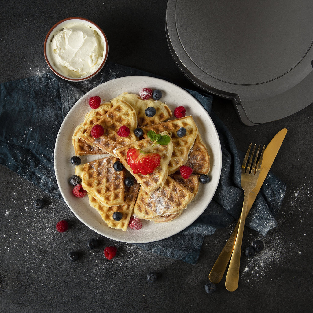 La gofrera Princess tiene un gran diámetro de 20 cm para que hornee un gofre grande que se puede dividir en cinco gofres con forma de corazón. Prepare un gofre para si mismo o compártalo con la familia y los amigos. Sírvalos con nata montada y fresas u hornee brownies compactos. Puede utilizar la gofrera incluso para hacer platos sabrosos como frittata y croquetas de patata y cebolla.