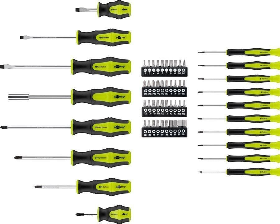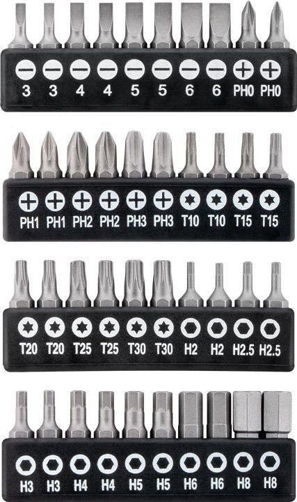- Desatornillador/puntas incluidas: Plano, Llave de vaso, Phillips, Estrella, Torx