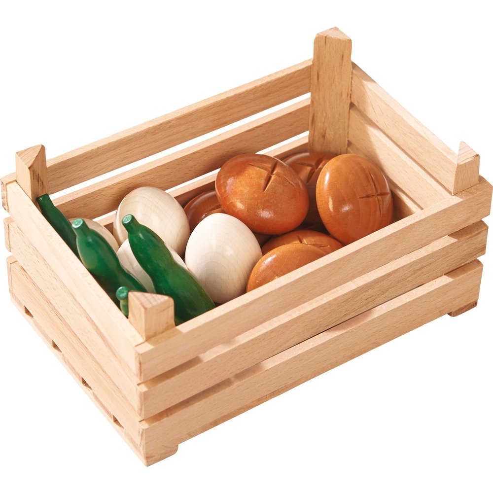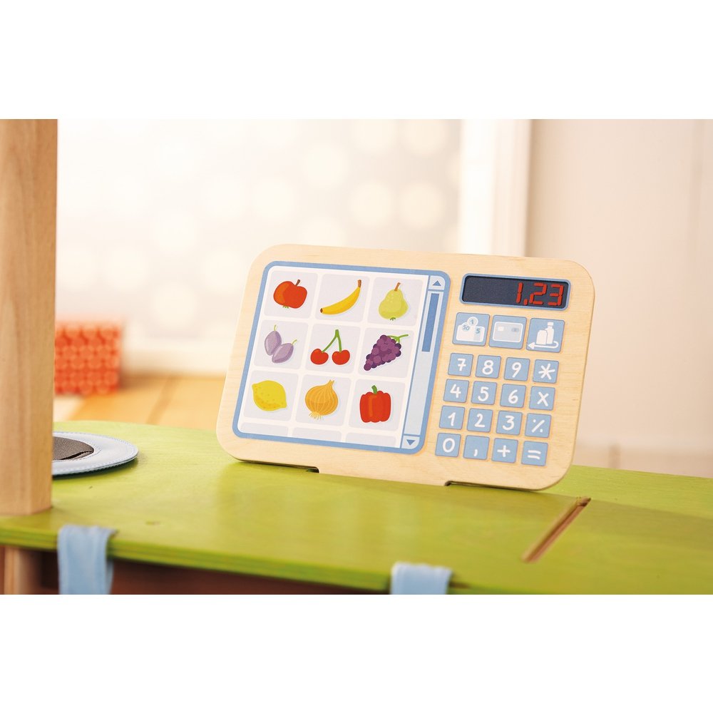 ¡Buenos días! ¿Qué le pongo? ¿Algo dulce o mejor algo salado? ¿Y qué le parece un poco de fruta y verdura fresca? El tenderete Compras Divertidas de HABA con un apartado para productos frescos integrado para ofrecer a sus pequeños clientes todo lo que necesitan, ya que el escaparate se puede abastecer de diferentes artículos para comprar a placer./Contenido:/1 caja registradora de madera que se encaja en el mostrador, 1 dispensador de bolsas de plástico, 2 cajas de madera (con 22 piezas), 1 red extraíble para botellas de plástico reciclables, 1 caja de tela de quita y pon, un bloc de notas.