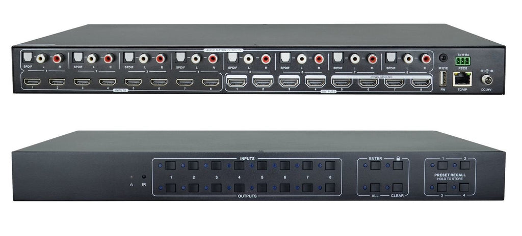 - Cantidad de puertos de entrada HDMI: 8 Cantidad de puertos de salida HDMI: 8 Puertos de entrada RJ-45: 1 Enchufe de entrada de CC