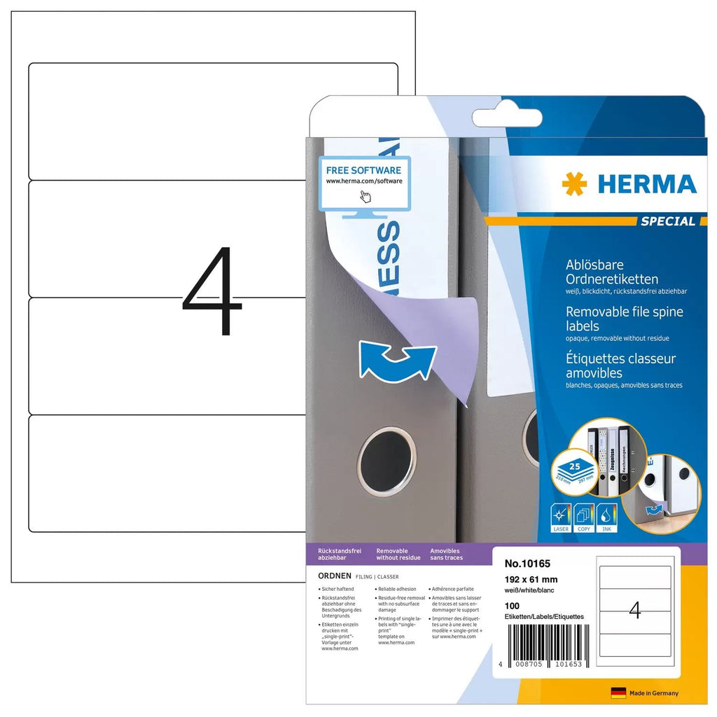 HERMA 10165, Blanco, Etiqueta para impresora autoadhesiva, A4, Papel, Laser/Inyección de tinta, Desmontable