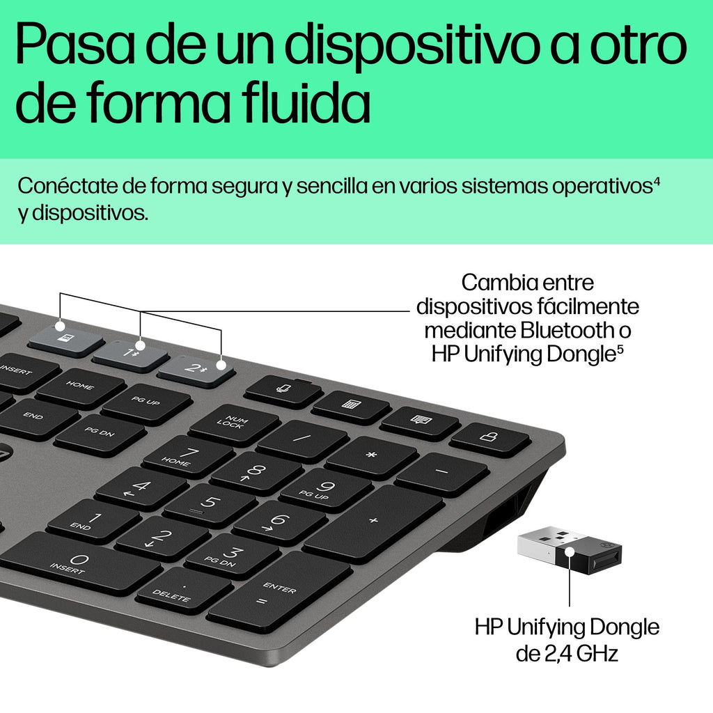 - Conéctate de forma segura y sencilla en varios sistemas operativos[4] y dispositivos: dos mediante Bluetooth y uno mediante el HP Unifying Dongle de 2,4 GHz. También puede cambiar fácilmente los periféricos conectados de un ordenador a otro con la tecla multidispositivo de este teclado[5].