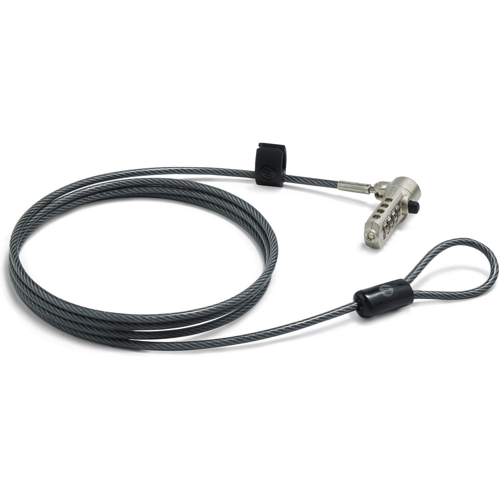 Rodea cualquier objeto fijo con el cable de acero galvanizado, recubierto con vinilo de 1,83 m (6 pies), engancha el portátil y bloquéalo con el mecanismo de presión sin llave y tu combinación personalizada de cuatro dígitos.