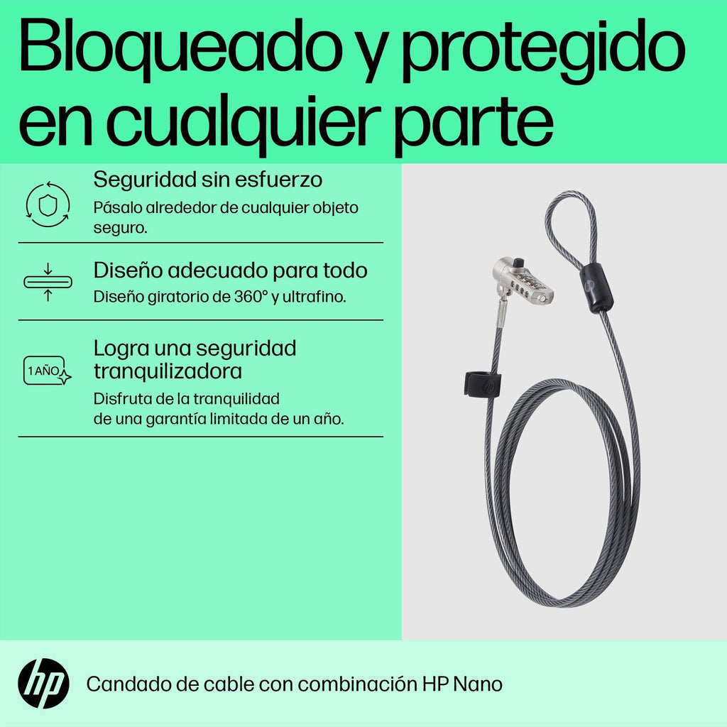Mantén el portátil bloqueado y seguro con el bloqueo de cable con combinación HP Nano, diseñado para cualquier portátil de HP con ranura de bloqueo HP Nano. Enlace y bloqueo con una combinación preestablecida única para una seguridad que no requiere llave, sin preocupaciones, prácticamente en cualquier lugar.