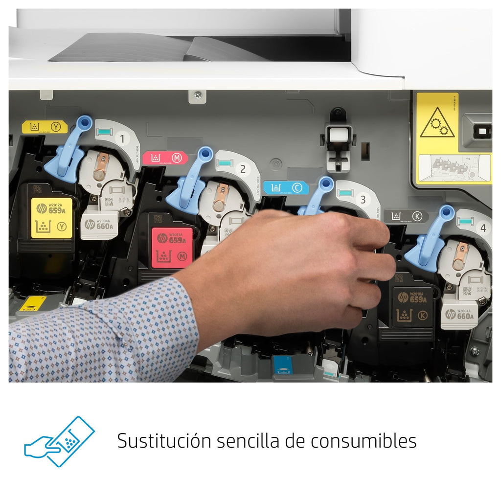 - Cartuchos de repuesto: W2010A Cartucho de tóner HP LaserJet 659A negro (16 000 páginas); W2011A Cartucho de tóner HP LaserJet 659A cian (13 000 páginas); W2012A Cartucho de tóner HP LaserJet 659A amarillo (13 000 páginas); W2013A Cartucho de tóner HP LaserJet 659A magenta (13 000 páginas); W2010X Cartucho de tóner HP LaserJet 659X negro (34 000 páginas); W2011X Cartucho de tóner HP LaserJet 659X cian (29 000 páginas); W2012X Cartucho de tóner HP LaserJet 659X amarillo (29 000 páginas); W2013X Cartucho de tóner HP LaserJet 659X magenta (29 000 páginas); W2004A Tambor de creación de imágenes Original HP LaserJet 660A (65 000 páginas, universal para los 4 colores)