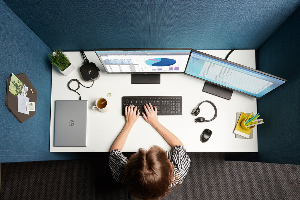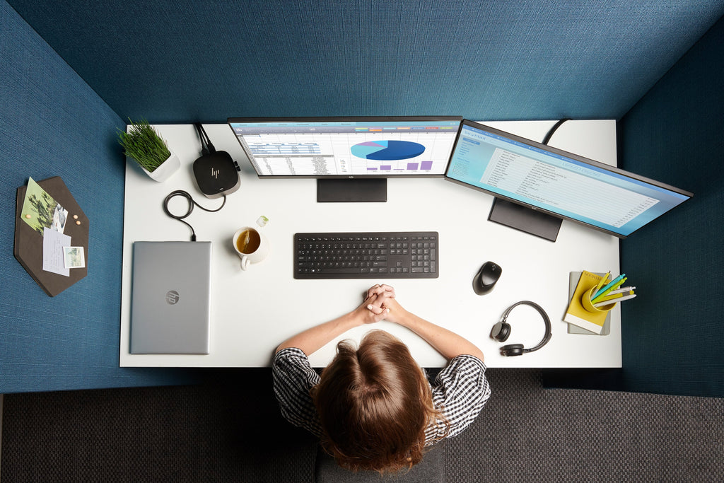 Agrega tus accesorios y hasta tres monitores a la base de acoplamiento. A continuación, simplemente conéctala a tu portátil con un solo cable USB-C® para acceder a tus dispositivos y cargar tu equipo.