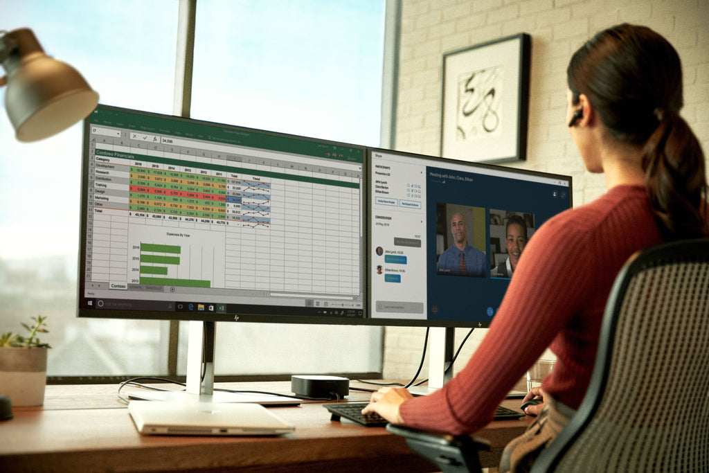 - Agrega tus accesorios y hasta tres pantallas 4K[3] a la base de conexión. Después simplemente conéctalo a tu portátil[1] a través de un cable USB-C™ para acceder a tus dispositivos y cargar tu PC.
