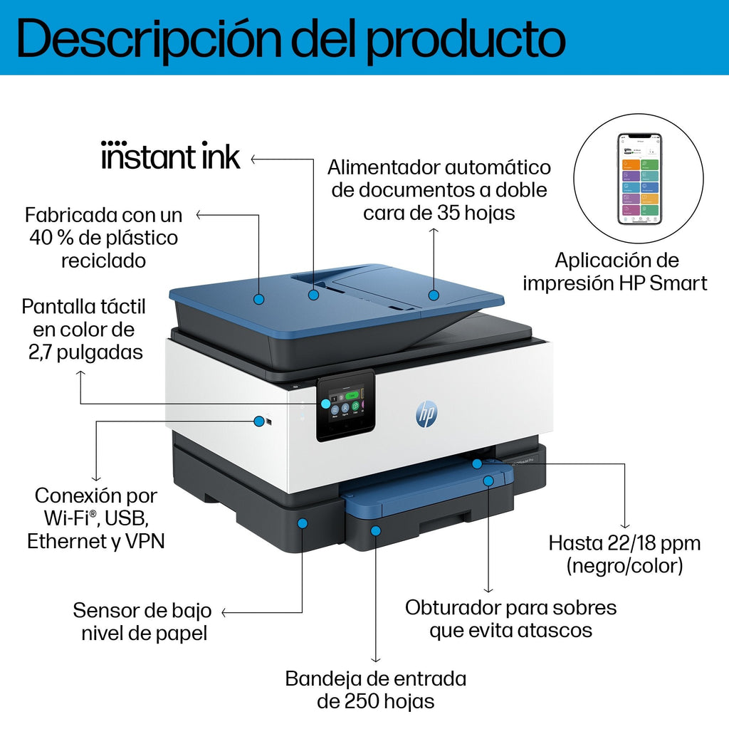 - HP+; Compatible con el servicio HP Instant Ink; Impresión desde móvil o tablet; Pantalla táctil; Escaneado avanzado inteligente; Papel instantáneo; Puerto frontal de unidad flash USB; Impresión a doble cara; Escaneado a doble cara; Alimentador automático de documentos; Fax