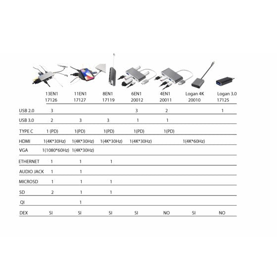 1 x salida USB tipo C 3.1 con tecnología PD para una carga ultra rápida 100W (20V/5A) de ordenadores, tablets y smartphones y transferencia de datos. 1 x salida USB 3.0 (5V/900mA) con transferencia de datos. 3 x salidas USB 2.0 (5V/500mA) con transferencia de datos. 1 x salida HDMI con resolución hasta 4K y 30Hz, compatible con la tecnología DeX