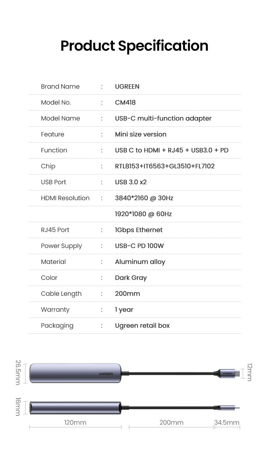 Ugreen 10919, Alámbrico, USB 3.2 Gen 1 (3.1 Gen 1) Type-C, 100 W, 10,100,1000 Mbit/s, Gris, Aluminio