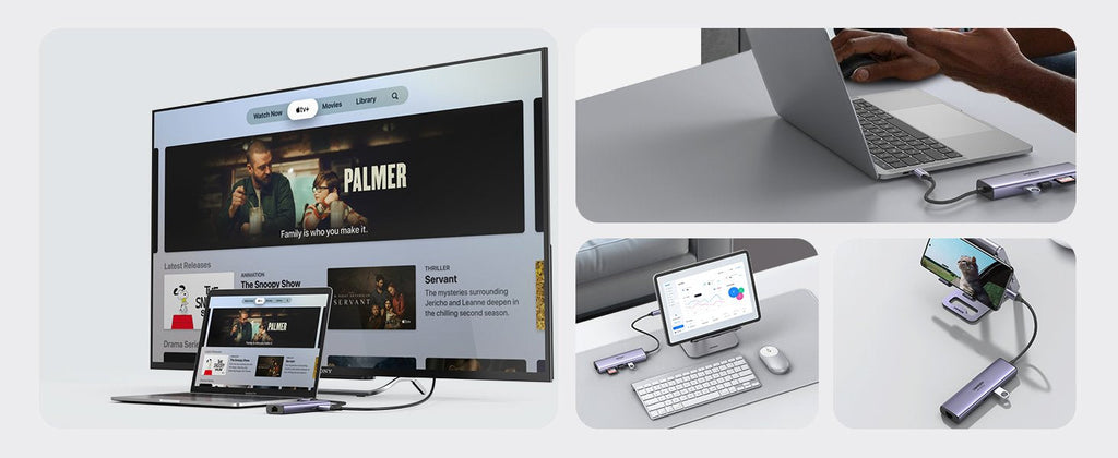 [ Hub USB C HDMI 4K 60Hz] Este hub USB C HDMI suporta resolução até 4K 60Hz, suporta modo duplicado e modo estendido, sendo muito ideal para assistir a filmes, fazer apresentações ou conferências, dar aulas, etc. Nota: Para alcançar 4K de 60 Hz, o seu computador deve suportar DP1.4, como MacBook Pro/MacBook Air, iPad Pro/iPad Pro Air. (Nota: Para funcionar bem, a porta USB C do seu dispositivo deve suportar a saída de vídeo)