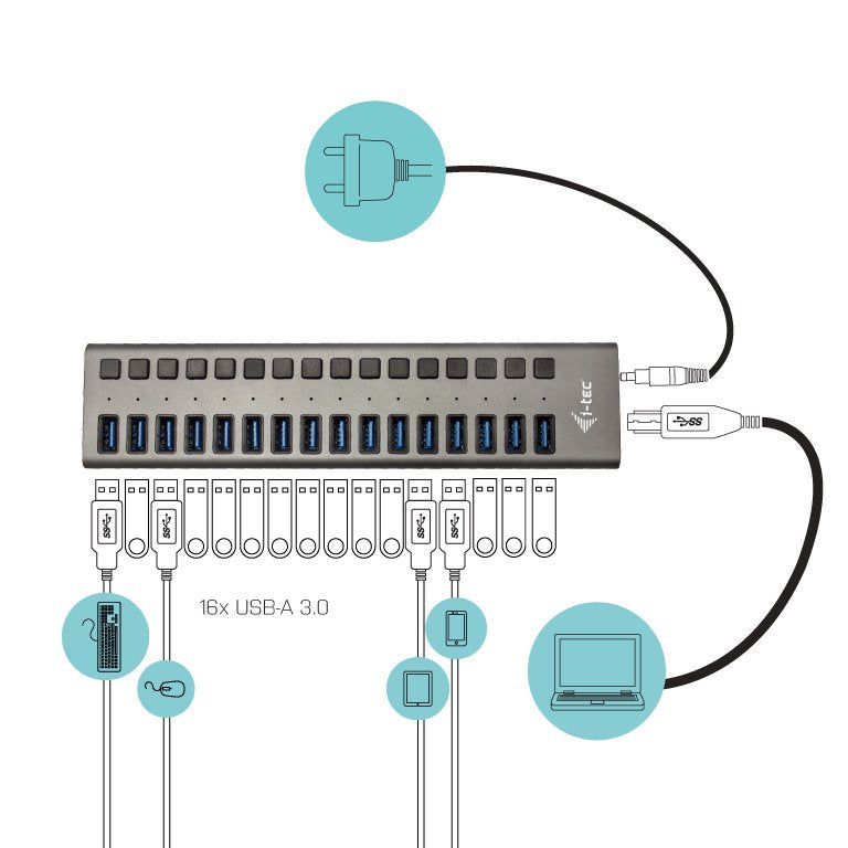 Descripción del producto largo: i-tec USB 3.0 Charging HUB 16port con el adaptador de alimentación 90 W, 16x puerto de carga USB 3.0, ideal para computadoras portátiles, ultrabooks, tabletas, computadoras de escritorio (PC), Windows, Mac, Linux