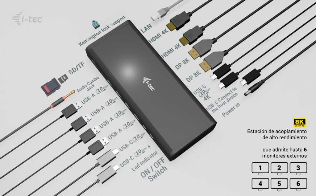 La estación de acoplamiento de mayor rendimiento. Admite hasta seis monitores externos a 4K/60Hz. O bien, ¡dos pueden funcionar simultáneamente incluso a 8K! El producto perfecto para los usuarios que necesitan varios monitores sin renunciar a la estabilidad de la imagen, la resolución y la frecuencia de actualización. La base también cuenta con un puerto de carga rápida USB-C (con hasta 30 W de potencia de carga), especial para cargar smartphones y tabletas, puertos USB rápidos, un puerto LAN de 2,5 Gbps, así como otros periféricos.
