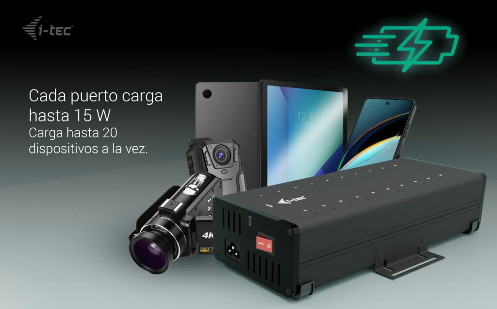 Este moderno HUB ofrece 20 USB-C con funcionalidad Plug & Play y hasta 15 W de carga por puerto. Con 20 puertos USB, el HUB puede cargar hasta 20 dispositivos a la vez.