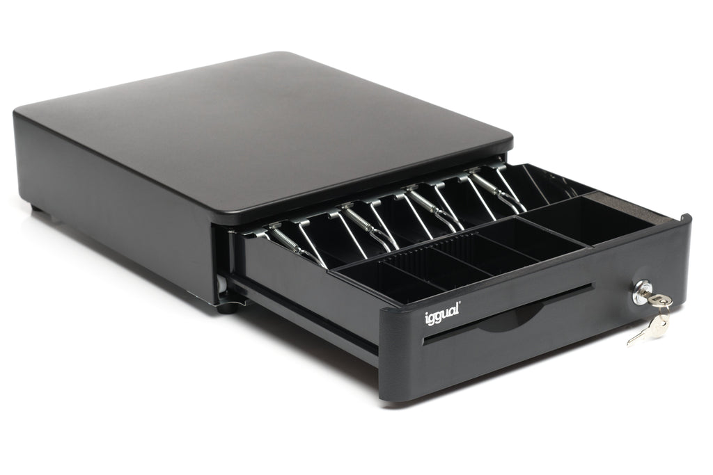 iggual Cajón Portamonedas IRON-10R 38cm 4+5 negro, Cajón de efectivo automático y manual, Plástico, Acero, Negro, 12 V, 380 mm, 335 mm