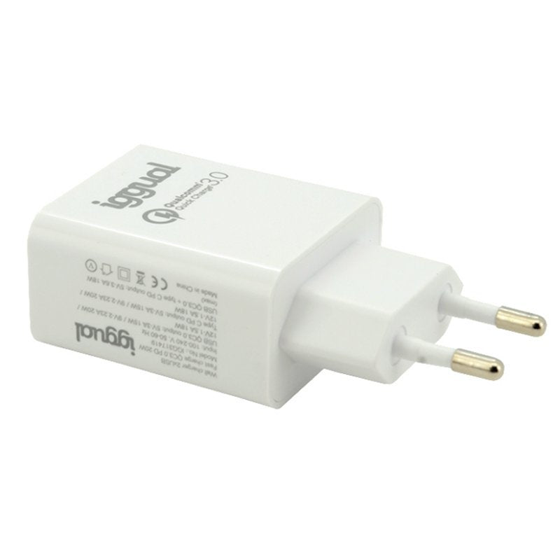 Carga hasta dos dispositivos móviles de manera simultánea con el cargador rápido de pared USB QC3.0 + PD de 20W de iggual.