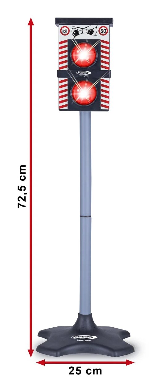 Radar de juguete JAMARA: aprender con luz y sonido. El radar de juguete de diseño realista de JAMARA convierte la educación vial en un emocionante juego de rol. Los pequeños policías de tráfico experimentan de primera mano el control del tráfico y lo que significa conducir demasiado rápido, y aprenden jugando lo importantes que son las normas de tráfico. Ya sea en la habitación de los niños, en la guardería o en el colegio: este radar de velocidad combina el atractivo educativo con la diversión lúdica real (es un juguete - ¡sin función de foto real!). Lo más destacado es el efecto intermitente realista: al igual que en la realidad, la luz intermitente se enciende en rojo y va acompañada de un tono de señalización a juego: ¡una experiencia que impresiona! La linterna se activa automáticamente mediante un detector de movimiento integrado o manualmente con sólo pulsar un botón. De este modo, los niños pueden decidir por sí mismos cuándo debe parpadear. El juego de 5 piezas es fácil y rápido de transportar y montar. Gracias a la gran base, los postes y el sistema de enchufe seguro, el radar de tráfico es estable y está listo para su uso inmediato. Ya sea como complemento para jugar con vehículos o como ayuda didáctica para la educación vial.