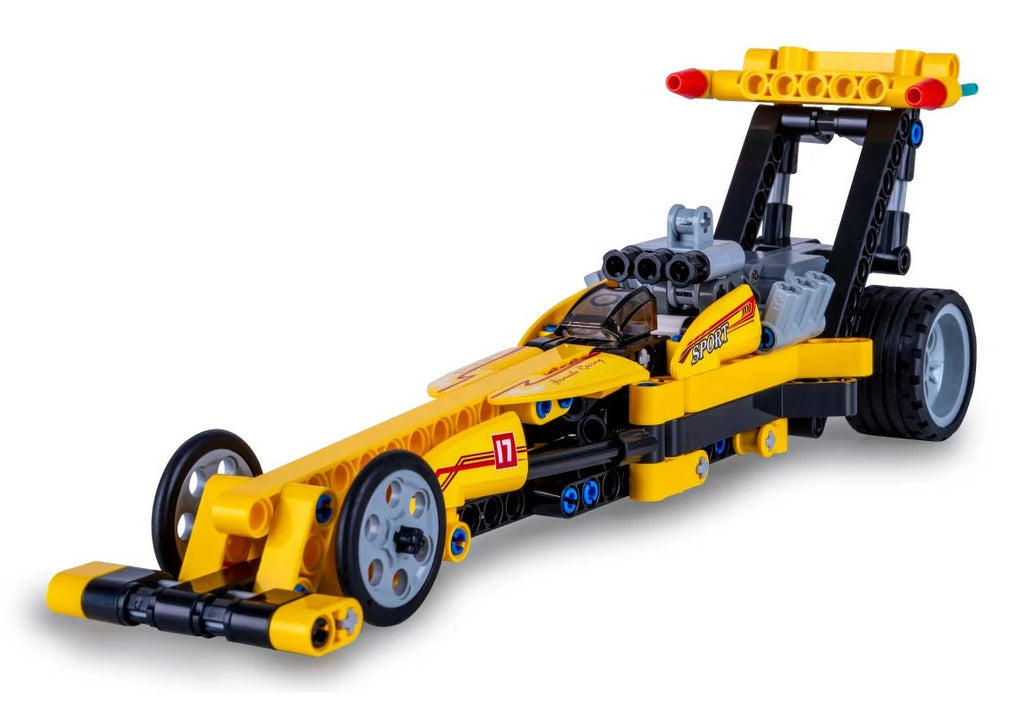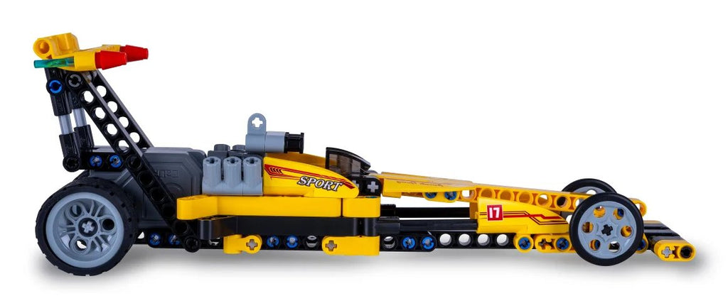 El CaDA Drag Racing de JAMARA. Un set de construcción de 151 piezas para todos los fans del automovilismo. ¡Bienvenidos al mundo de CADA Bricks, una marca que representa calidad, precisión y diversión ilimitada al construir! JAMARA ofrece este set de bloques de alta calidad que entusiasma tanto a principiantes como a constructores experimentados. Gracias al ajuste perfecto y a la construcción robusta, las piezas permiten crear modelos detallados, impresionantes obras arquitectónicas o creaciones únicas. La construcción bien pensada y las instrucciones detalladas hacen que este set sea una experiencia especial. El Drag Racing lleva el emocionante mundo de las carreras de aceleración a las habitaciones infantiles. Con un diseño fiel al detalle que refleja la dinámica y agresividad de un auténtico dragster, este modelo ofrece una experiencia emocionante de construcción y juego. Los neumáticos de goma con perfil garantizan un excelente agarre en la pista y proporcionan la verdadera sensación de drag racing. El parabrisas transparente y la hoja de adhesivos aportan un toque aún más realista al diseño del dragster. Gracias al motor de retroceso, el modelo se pone en marcha y está listo para emocionantes carreras.